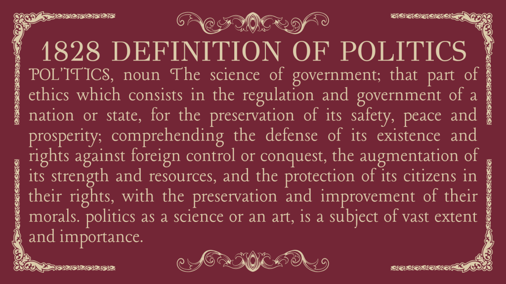 Here is how Noah Webster defined “Politics” in his 1828 Dictionary: